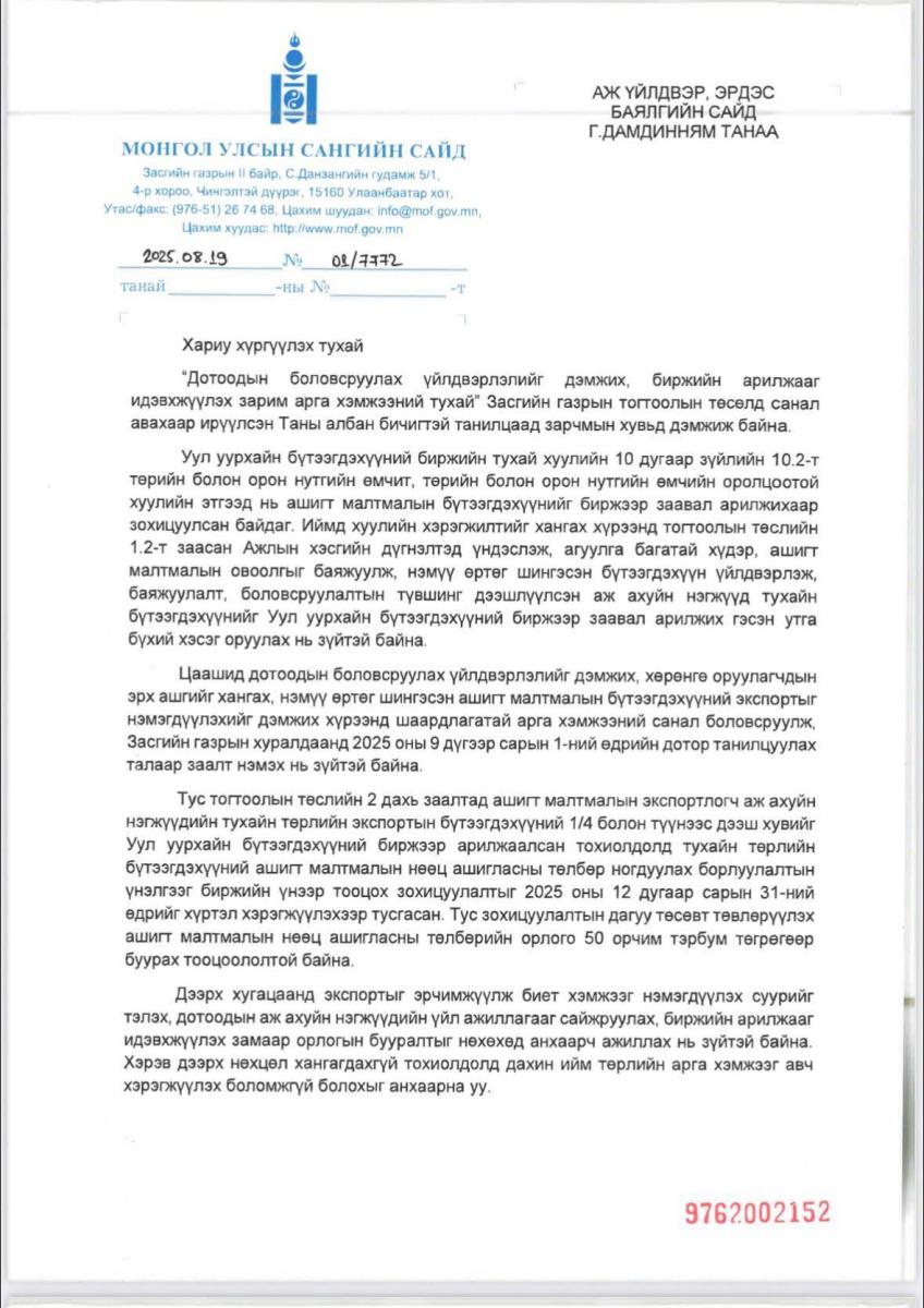 Засгийн газрыг огцруулах асуудлыг өргөн бариад буй УИХ-ын гишүүн П.Сайнзориг Засгийн газрын 2025 оны 55 дугаар тогтоолын асуудлаар дахин байр сууриа илэрхийллээ. Тэрбээр, уг тогтоолыг батлахаас өмнө Сангийн сайд Б.Жавхлан сайдын өгсөн саналыг харахад,