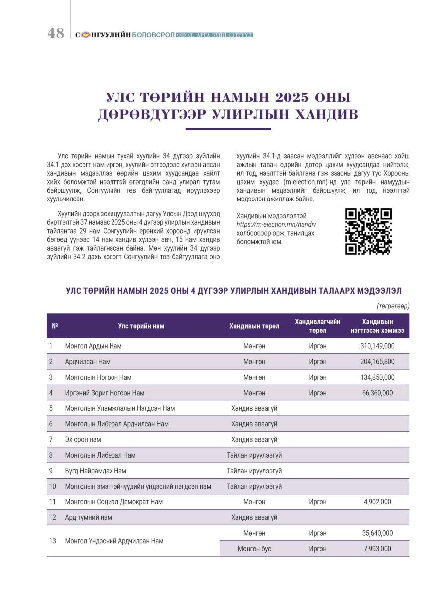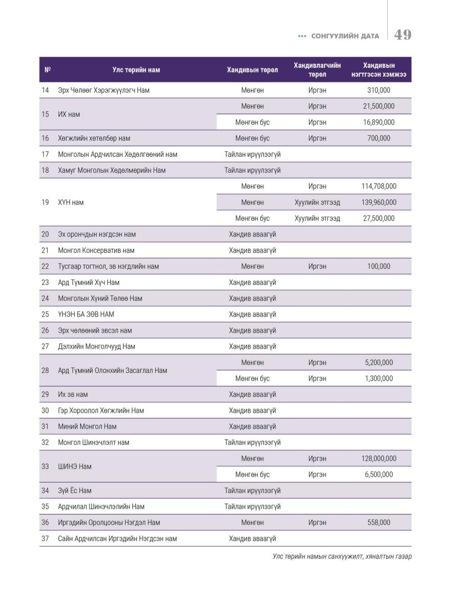 Хуулийн дээрх зохицуулалтын дагуу Улсын Дээд шүүхэд бүртгэлтэй 37 намаас 2025 оны 4 дүгээр улирлын хандивын тайлангаа 29 нам Сонгуулийн ерөнхий хороонд ирүүлсэн бөгөөд үүнээс 14 нам хандив хүлээн авч, 15 нам хандив аваагүй гэж тайлагнасан байна.