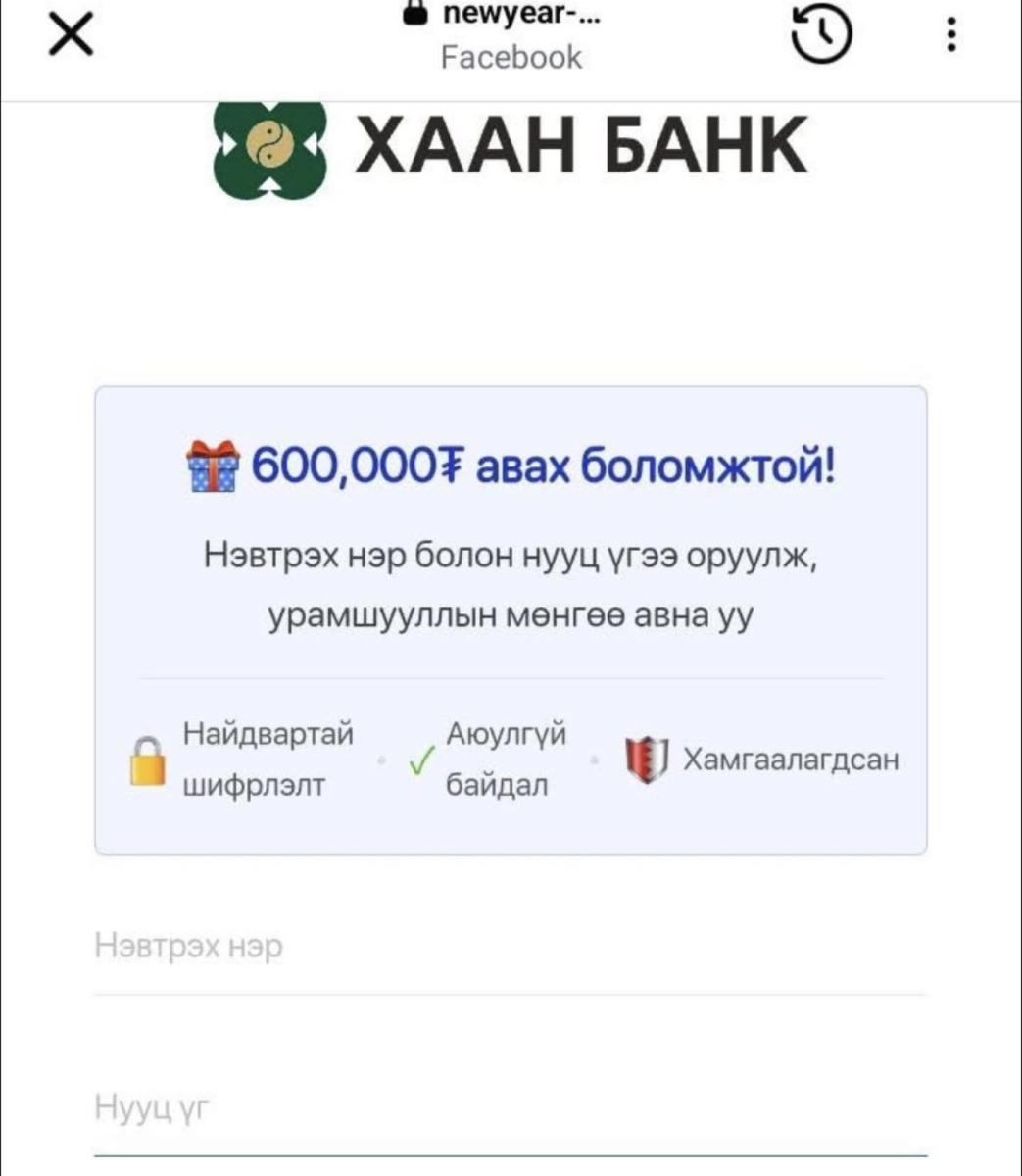 Сүүлийн өдрүүдэд цахим орчинд Хаан банкны логог хууль бусаар ашиглан “600,000 төгрөг авах боломжтой!” гэх агуулгатай хуурамч зар, линк түгээх тохиолдол нэмэгдэж байна. Эдгээр нь иргэдийг төөрөгдүүлж, линкээр нэвтрүүлэх замаар хувийн болон дансны мэдээллийг хууль бусаар олж авах зорилготой хуурамч зар сурталчилгаа юм.