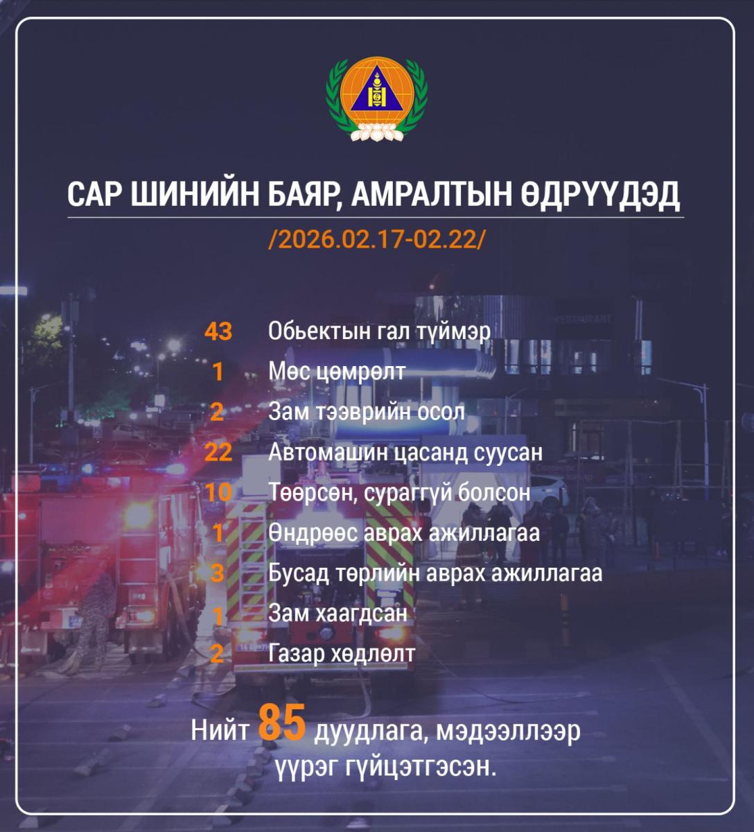 Алба хаагчид гамшиг, аюулт үзэгдэл, ослын 85 удаагийн дуудлагаар ажиллаж, 195 иргэний аюулгүй байдлыг ханган ажиллаж, цасанд суусан 23 автомашиныг татан гаргалаа.