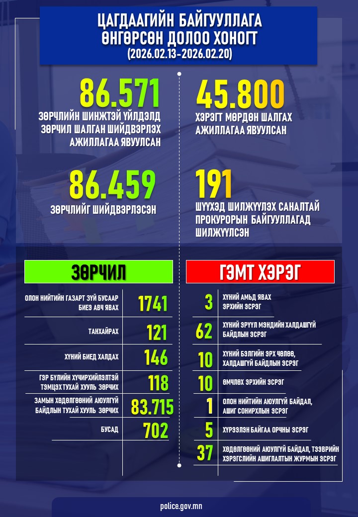 Зөрчлийн шинжтэй 86.571 үйлдэлд зөрчил шалган шийдвэрлэх ажиллагаа явуулж, 86.459 зөрчлийг шийдвэрлэсэн байна.
