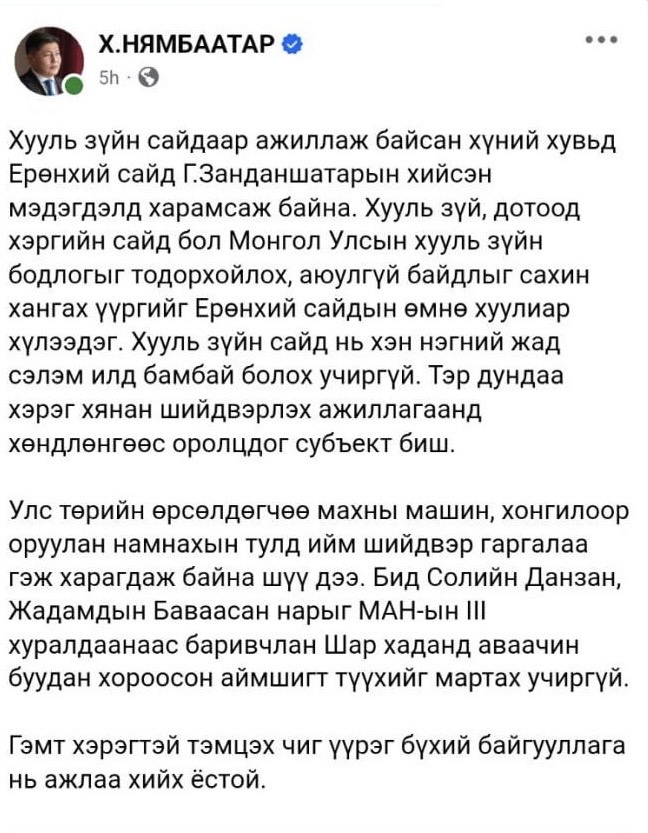 Тэрбээр “Хууль зүйн сайдаар ажиллаж байсан хүний хувьд Ерөнхий сайд Г.Занданшатарын хийсэн мэдэгдэлд харамсаж байна. Хууль зүй, дотоод хэргийн сайд бол Монгол Улсын хууль зүйн бодлогыг тодорхойлох, аюулгүй байдлыг сахин хангах үүргийг Ерөнхий сайдын өмнө хуулиар хүлээдэг. Хууль зүйн сайд нь хэн нэгний жад, сэлэм, илд, бамбай болох учиргүй. Тэр дундаа хэрэг хянан шийдвэрлэх ажиллагаанд хөндлөнгөөс оролцдог субъект биш.