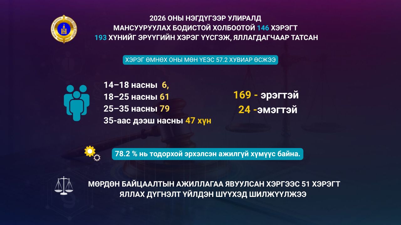 Прокурорын байгууллага 2026 оны нэгдүгээр улиралд мансууруулах бодистой холбоотой 192 гэмт хэргийн талаарх гомдол, мэдээлэл, 185 хэрэгт хяналт тавьж ажилласан нь өмнөх оны мөн үеэс 106 хэргээр буюу 57.2 хувь өссөн байна. Дээрх гомдол, мэдээлэл, хэрэгт 193 хүнийг эрүүгийн хэрэг үүсгэж, яллагдагчаар татан 146 хэрэгт мөрдөн байцаалтын ажиллагаа явууллаа.