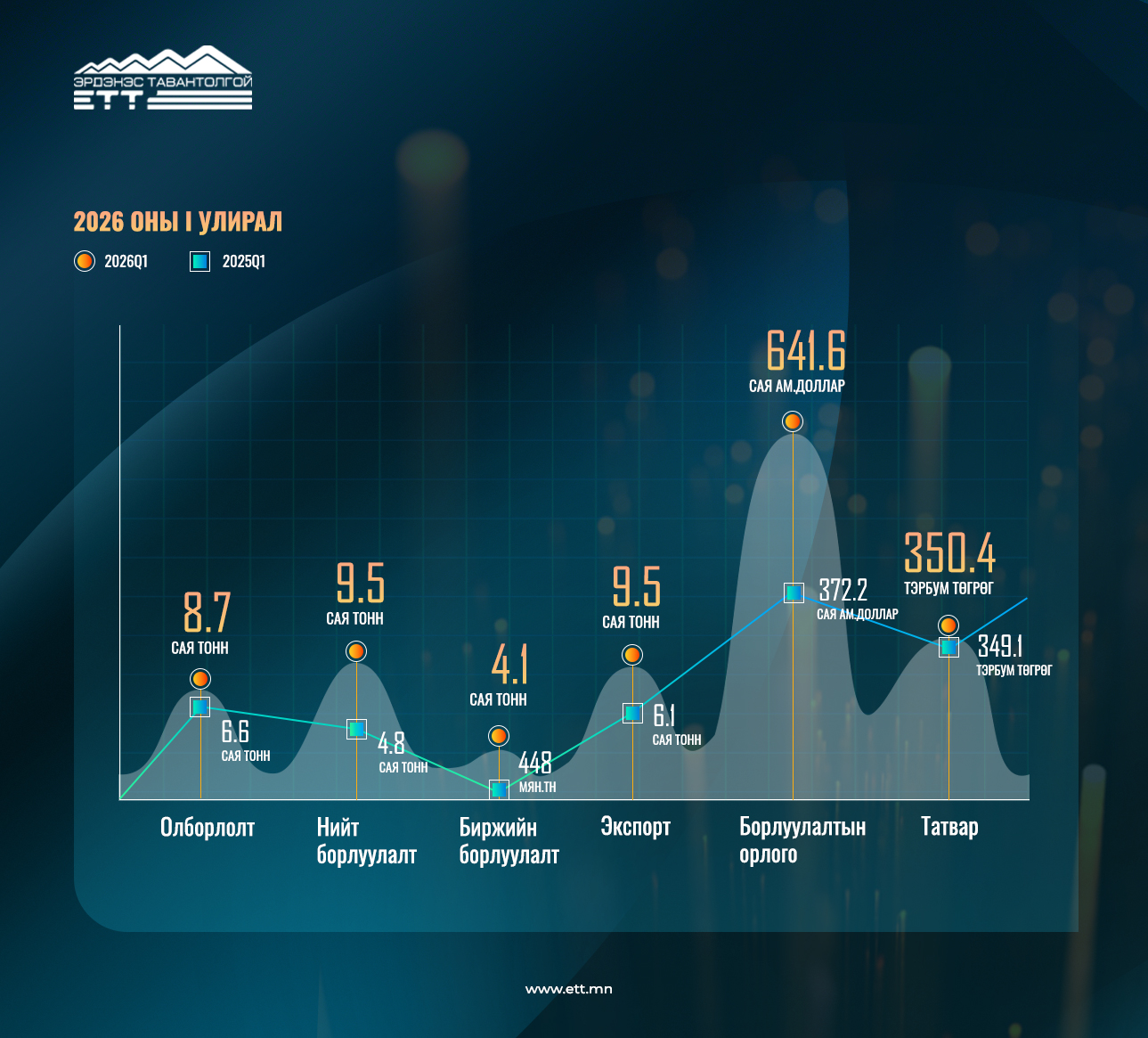 Экспорт 2026 оны 1 дүгээр улиралд 9.5 сая тоннд хүрч өмнөх оны 1 дүгээр улирлын экспортын хэмжээнээс 56 хувь өссөн байна. Үүний 51 хувь буюу 4.9 сая тонн нүүрс нь хүргэж өгөх нөхцөлтэй биржийн экспорт, 49 хувь буюу 4.6 сая тонн нүүрс нь урт хугацаат буюу ам нөхцөлтэй гэрээний нүүрс эзэлж байна.